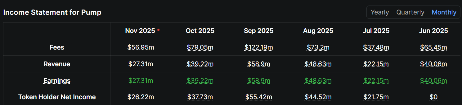 По данным DefiLlama, ежемесячный доход Pump.fun упал ниже $40 млн впервые с июля, упав до $27,3 млн в ноябре, что на 53% ниже сентябрьских $58,9 млн.