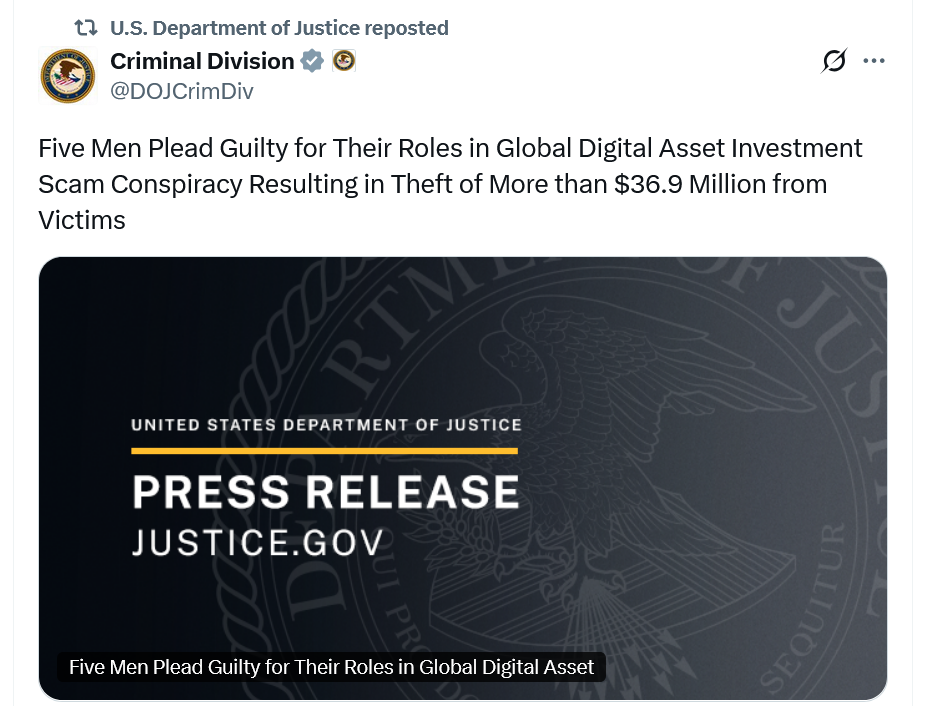 Пять мужчин признали себя виновными в своей роли в схеме международной криптовалюты в 36,9 млн. Долл. США, которая нацелена на американцев, при этом средства в конечном итоге были отправлены в центр мошенничества в криптовалюте в Камбодже.