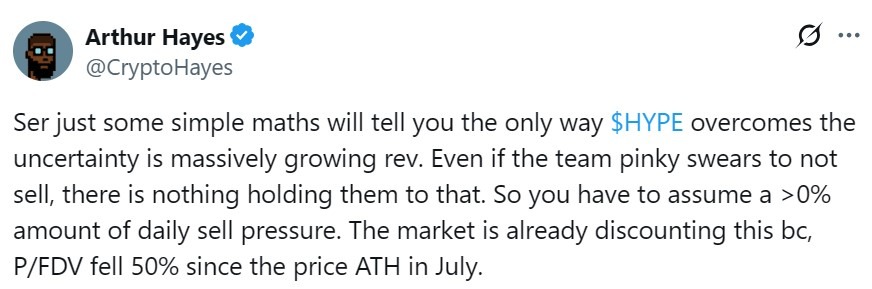 Он указал на резкое падение соотношения цены и полностью разводненной оценки Hyperliquid с июля как на доказательство того, что трейдеры уже игнорируют предстоящий риск размывания, если только рост доходов не продолжит опережать рост предложения.