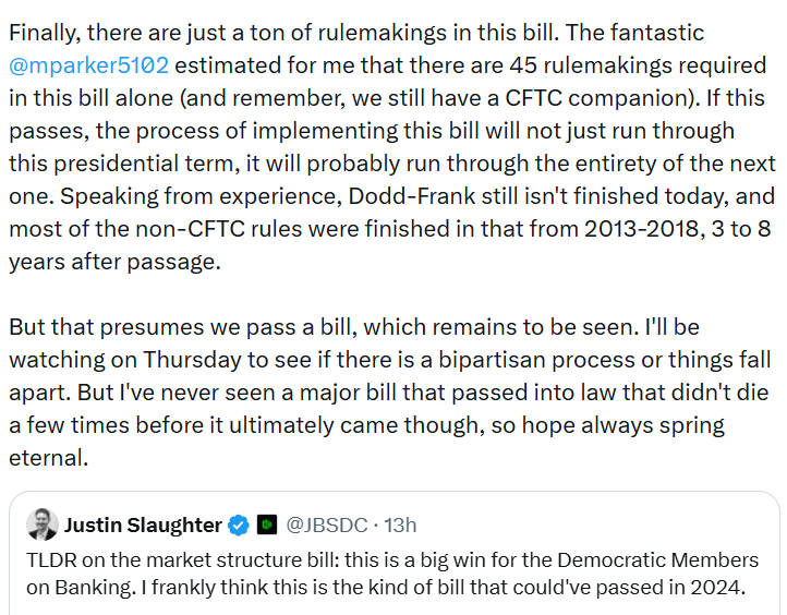 Законопроект о структуре рынка криптовалют еще должен быть принят, прежде чем можно будет начать разработку каких-либо правил, и Слотер предполагает, что это также может занять некоторое время.
