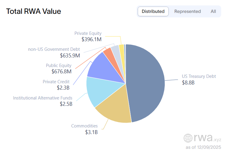 На сегодняшний день на рынке токенизации доминируют продукты Казначейства США, частные кредиты и институциональные альтернативные фонды, хотя, согласно отраслевым данным, токенизированные государственные акции и другие типы активов также начинают набирать обороты.
