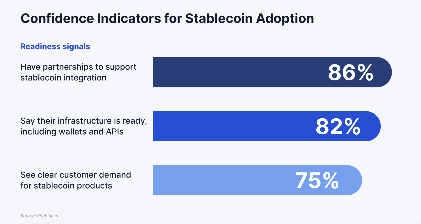 Согласно опросу Fireblocks, 86% респондентов говорят, что их компания показывает «готовность инфраструктуры». Другими словами, их компании готовы принять StableCoin. Кроме того, 75% респондентов говорят, что они видят четкий спрос клиентов на стаблеки.