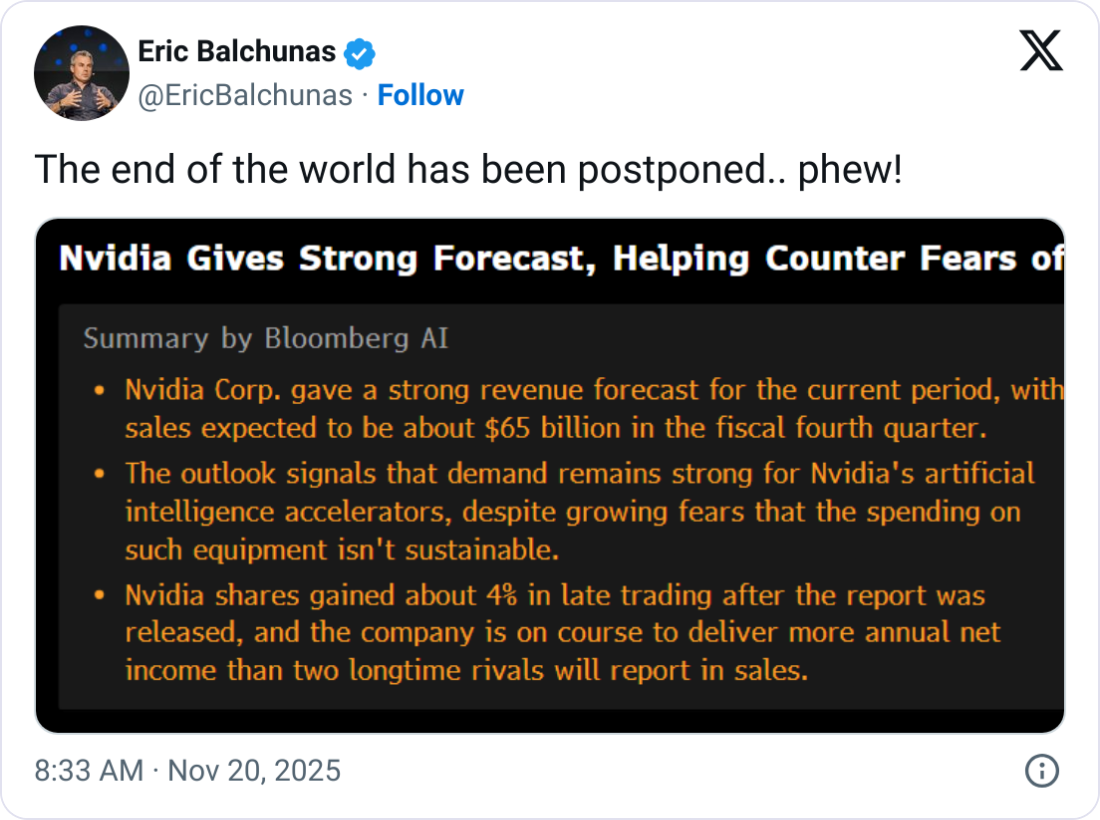 Акции технологических и криптовалютных компаний выросли после закрытия торгов в среду после того, как прибыль производителя чипов Nvidia в третьем квартале превзошла ожидания по выручке и прибыли, развеяв опасения по поводу пузыря ИИ.