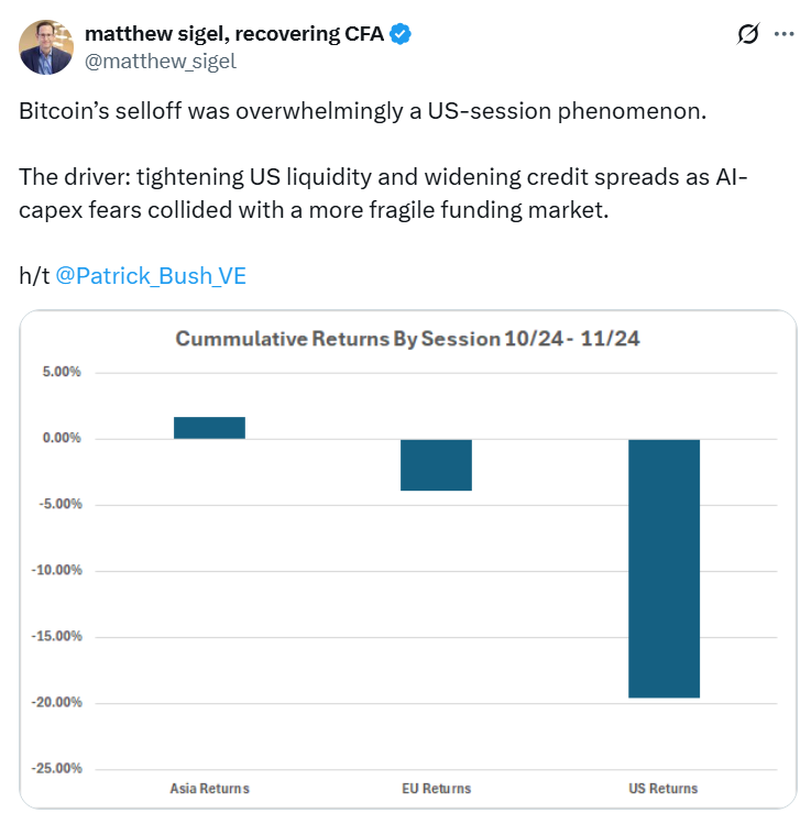 Мэтью Сигел, руководитель отдела исследований цифровых активов инвестиционного менеджера VanEck, заявил в понедельник, что недавняя распродажа Биткоина, в результате которой цена токена упала до минимума около 82 000 долларов, была «в подавляющем большинстве феноменом американской сессии».