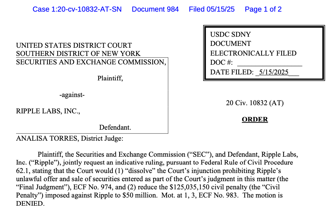 Согласно судебному документу, Торрес отклонил ходатайство как «процедурно неправомерное», поскольку SEC и Ripple не смогли подать правильное процедурное ходатайство в поддержку предлагаемого урегулирования.