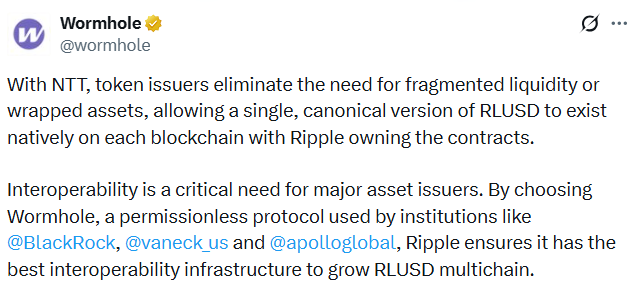 Команда Wormhole заявила в посте X в понедельник, что ее стандарт Native Token Transfers позволит RLUSD перемещаться по блокчейнам как настоящий токен, а не синтетическая или завернутая копия, что поможет поддерживать ликвидность.
