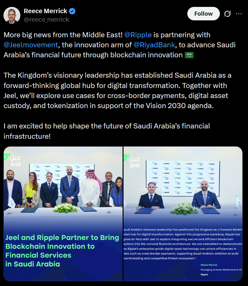 Ripple установила партнерские отношения с инновационным подразделением Riyad Bank, крупного финансового учреждения Саудовской Аравии, для изучения использования технологии блокчейна в финансовой системе страны, что сигнализирует о растущем интересе к инфраструктуре на основе блокчейна на институциональном уровне.