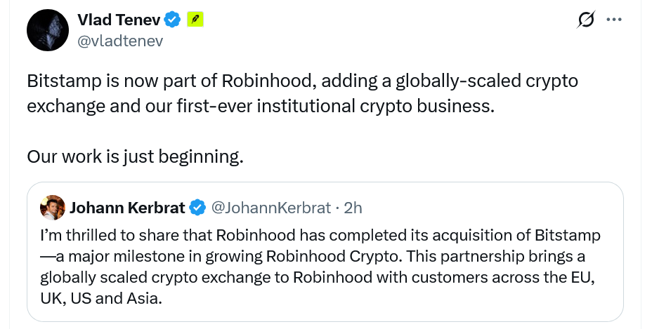 Robinhood Markets, Inc. закрыла приобретение 200 миллионов долларов США на базирующуюся в Люксембурге Bitstamp, добавив более 50 лицензий и регистраций и устоявшейся институциональной клиентской базы в свою криптовалюту.