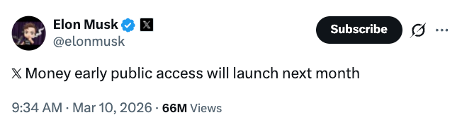 Тем не менее, в марте Маск заявил, что X Money запустится в апреле.