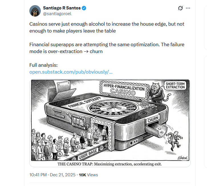 “Если бы я был на этом месте, я бы отдал приоритет продуктам, которые пользователи естественным образом хотят получить по мере их финансового взросления: кредитные карты, страхование, сберегательные инструменты. Это скучно. Данные показывают, что именно поэтому они работают. Они соседствуют с основными отношениями управления ликвидностью домохозяйств”.
