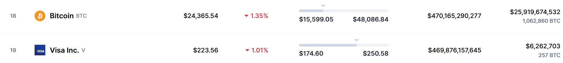 По данным CoinMarketCap, при цене BTC в настоящее время на уровне 24 365 долларов США его рыночная капитализация в размере 470,16 миллиарда долларов теперь немного выше, чем у Visa с рыночной капитализацией в 469,87 миллиарда долларов.