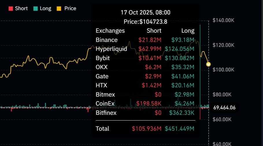 Из этой суммы примерно $451 миллион поступил от длинных позиций, а $105 миллионов — от коротких ликвидаций.