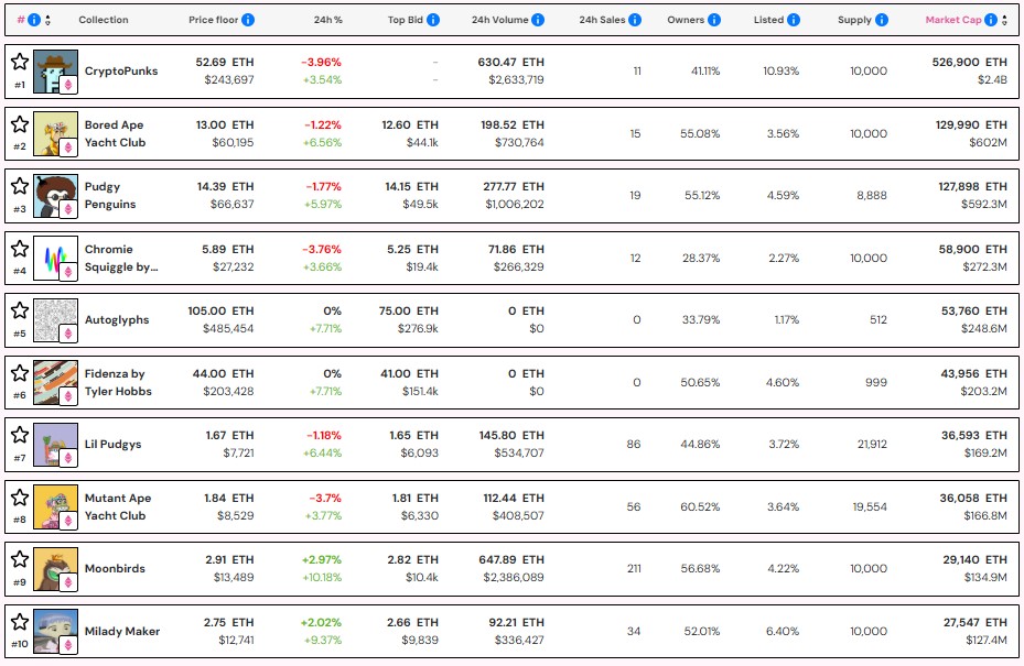 Cryptopunks сохраняет свое место в качестве лучшей коллекции NFT в результате рыночной капитализации. Данные по цене NFT показывают, что коллекция стоит не менее 526 900 ETH (около 2,4 миллиарда долларов).