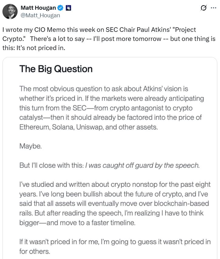 Мэтт Хуган из Bitwise во вторник сказал, что речь застала его «врасплох», и заставила его задуматься, было ли видение Аткинса на рынке.