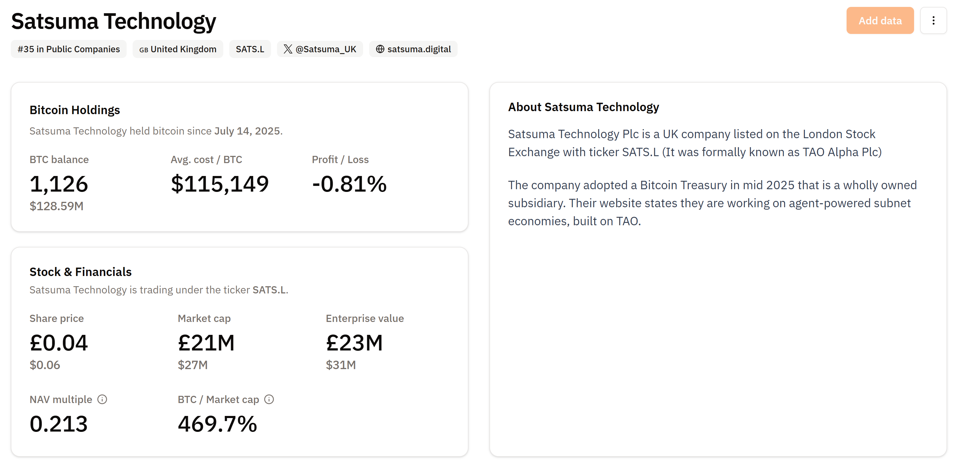 Сацума владеет 1126 BTC стоимостью приблизительно 128,66 млн. Долл. США, приобретая активы с 14 июля. Средняя стоимость компании на биткоин составляет 115 149 долл. США, что размещает свою текущую позицию с небольшой нереализованной потерей 0,76%, согласно данным BitCointReasuries. NET.