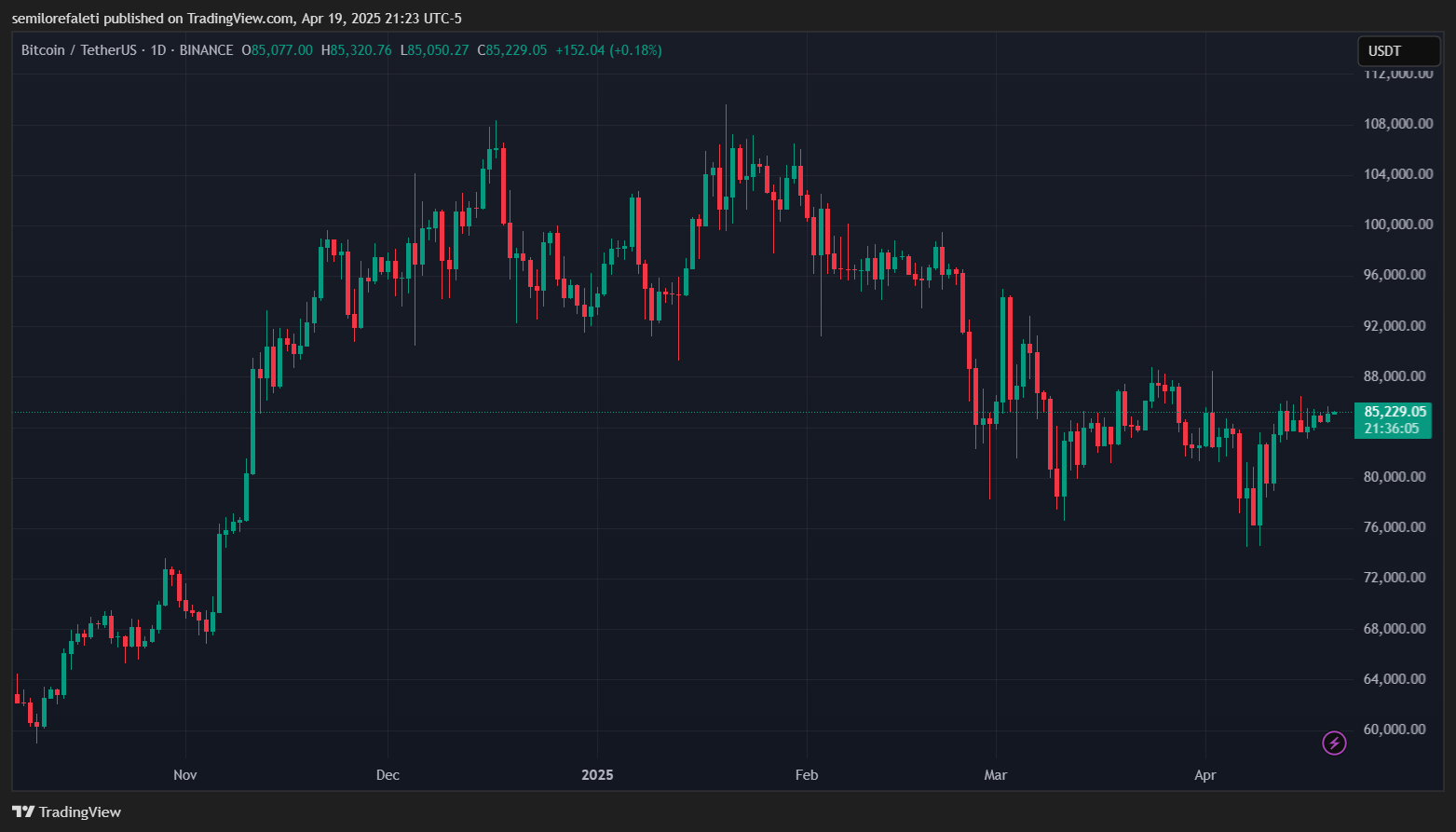 BTC Trading по цене $85 229 на ежедневной диаграмме |Источник: диаграмма BTCUSDT на TradingView.com