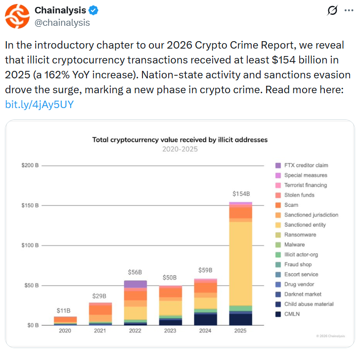В 2025 году на незаконные криптовалютные адреса было получено не менее 154 миллиардов долларов, что на 162% больше, чем в прошлом году, по сравнению с 59 миллиардами долларов в 2024 году, что в первую очередь обусловлено стоимостью, полученной организациями, попавшими под санкции.