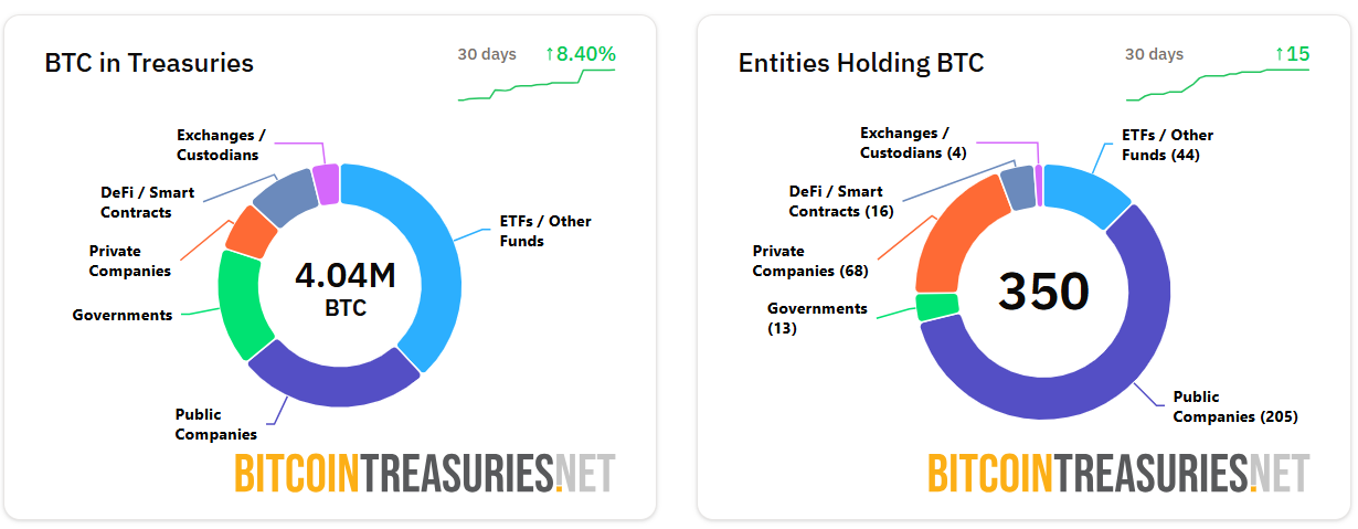 Большая часть этого движения восходит к Стратегии Майкла Сэйлора, первой крупной публичной компании, которая приняла Биткоин (BTC) в качестве основного резервного актива казначейства — позиция, которая с тех пор выросла почти до 700 000 BTC.