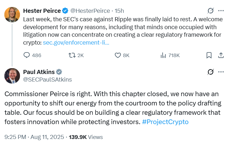 Заключение дела является «приветственной разработкой», которая позволяет «умы, когда -то занятые судебными разбирательствами, теперь может сконцентрироваться на создании четкой структуры регулирования для криптора», – сказал комиссар SEC Хестер Пирс в понедельник X Post.