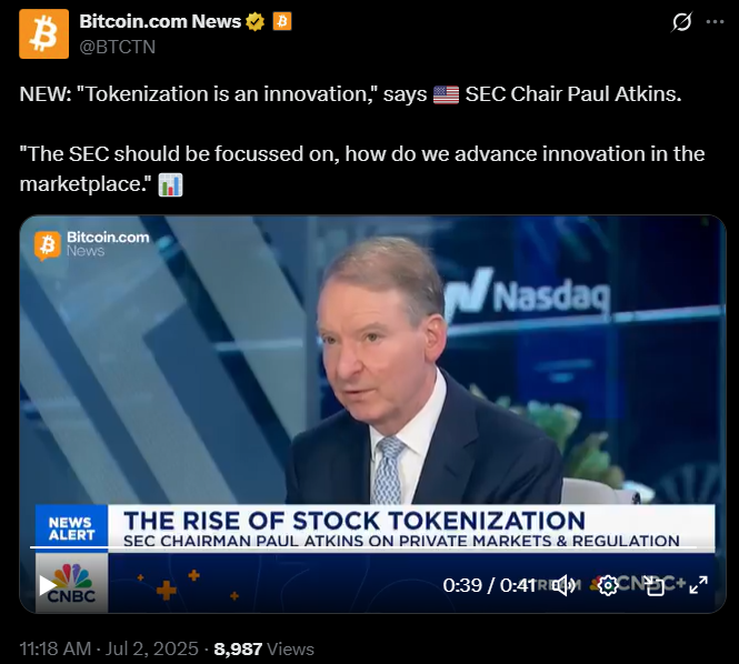 По словам председателя Пола Аткинса, Комиссия по ценным бумагам и биржам США (SEC) в настоящее время рассматривает токенизацию как «инновации» на рынке, который указал на четкий нормативный сдвиг с тех пор, как закончилось пребывание бывшего председателя SEC Гари Генслера.