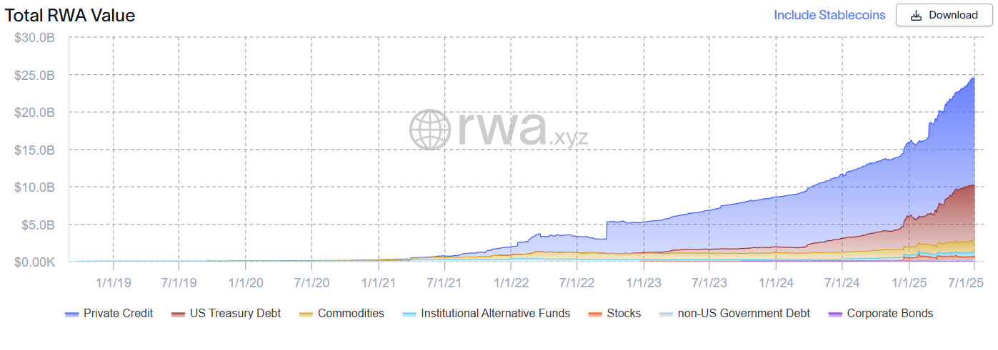 За исключением стаблеков, общая стоимость токенизированных активов в реальном мире превысила 24 миллиарда долларов в первой половине года, при этом частный кредит и казначейство США составляли основную часть рынка, согласно отчету Redstone.