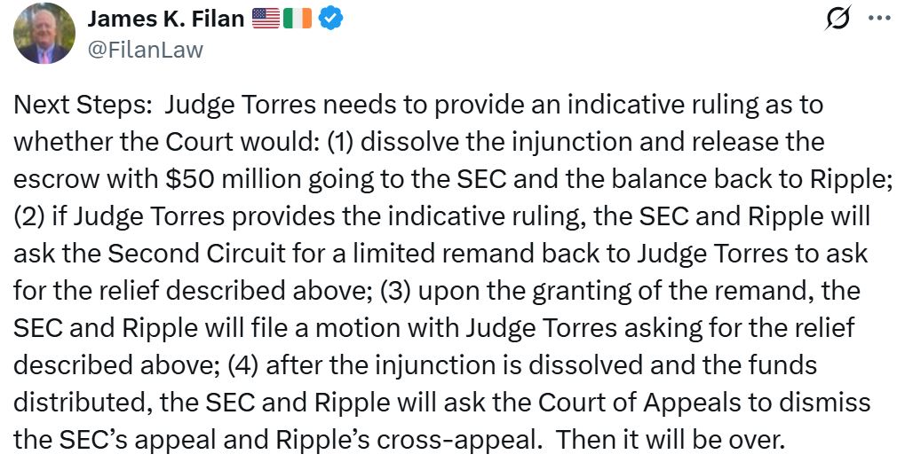 Если Торрес дает индикативное решение, SEC и Ripple просят второй окружной апелляционный суд для ограниченного приговора к судье Торресу, который, если он будет предоставлен, приведет к тому, что другое ходатайство будет подано на согласованное урегулирование, по словам Филана.