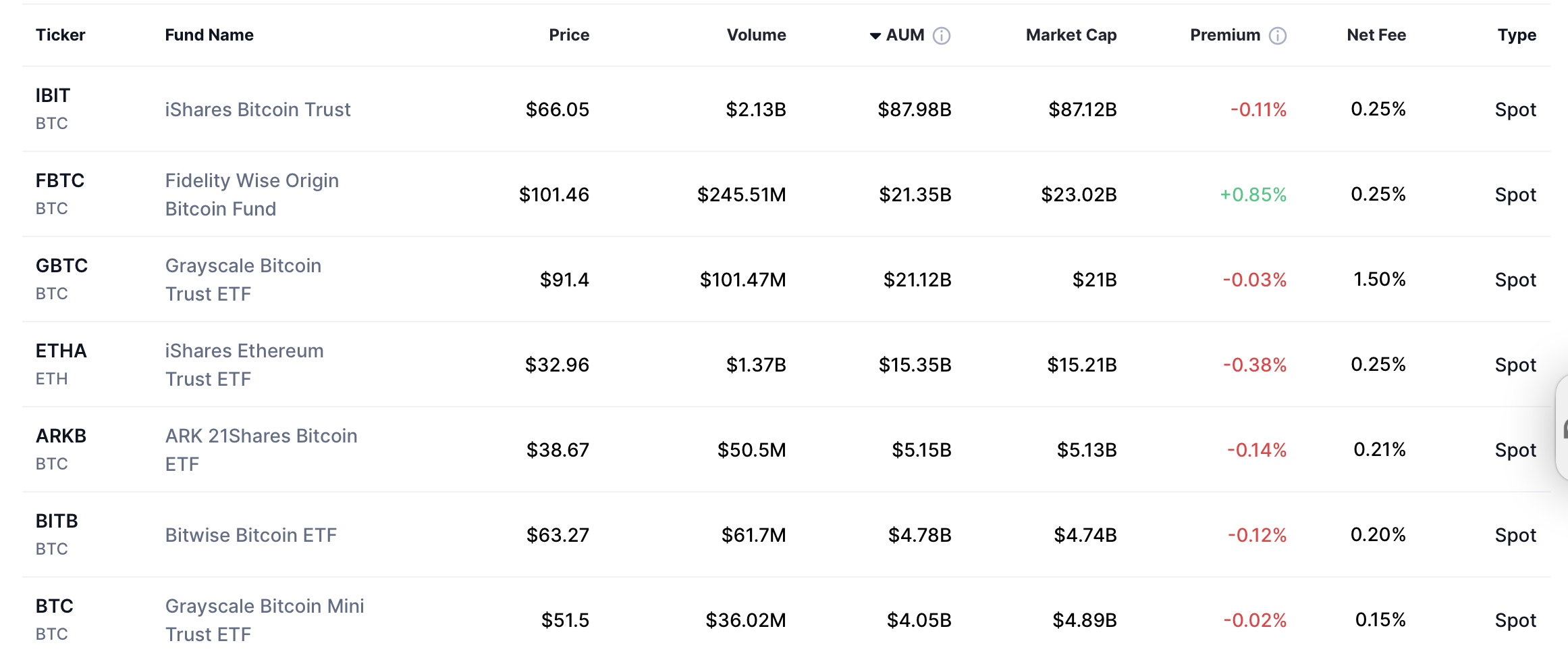 BlackRock’s Ishares Bitcoin Trust доминирует в области, с активами в управлении более 87 миллиардов долларов (AUM). Его масштаб, ликвидность и прочность на бренд отличают его, вытягивая большую часть потоков, в то время как конкуренты остаются намного меньше.