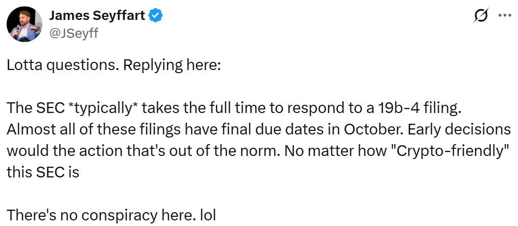 Аналитик Bloomberg ETF Джеймс Сейффарт сказал на X, что оба задержки ожидались, поскольку SEC «обычно требуется полный рабочий день, чтобы отреагировать на подачу 19B-4».