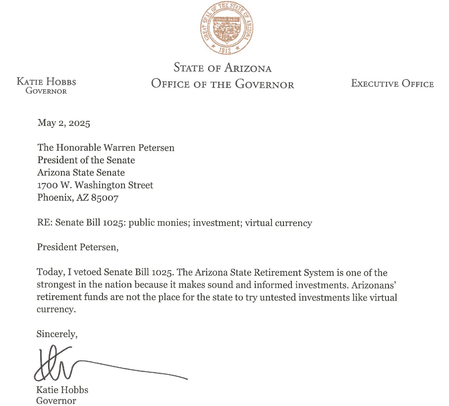 Тем не менее, Хоббс наложил вето на законопроект 2 мая, сославшись на опасения, что пенсионные фонды не должны подвергаться «непроверенным инвестициям, таким как виртуальная валюта».