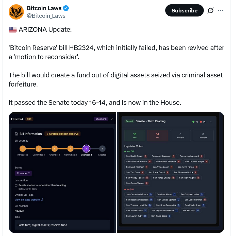 Один из законопроектов о Биткоинском резерве Аризоны был возрожден после того, как в четверг Сенат штата принял ходатайство о пересмотре законопроекта.