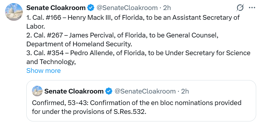 Два подтверждения были включены в пакет из почти 100 других кандидатов, выбранных администрацией Трампа на различные должности в правительстве, который был принят Сенатом 53 голосами против 43 в четверг.