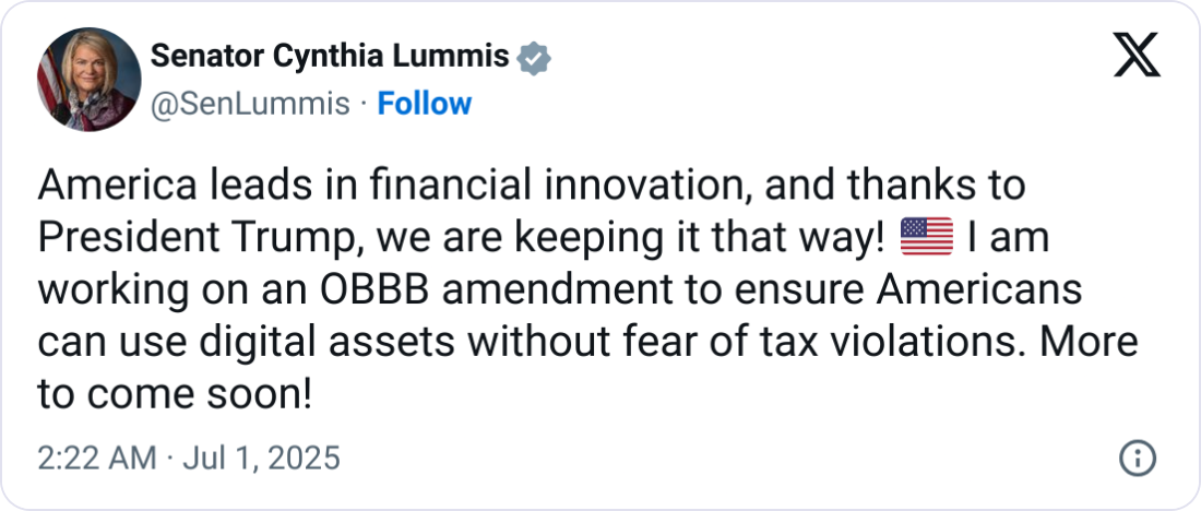Сенатор -республиканец Синтия Ламмис вложил поправку, по ее словам, была направлена на прекращение «несправедливого налогового режима» криптовалюты и «обеспечит американцы использовать цифровые активы без страха перед налоговыми нарушениями».