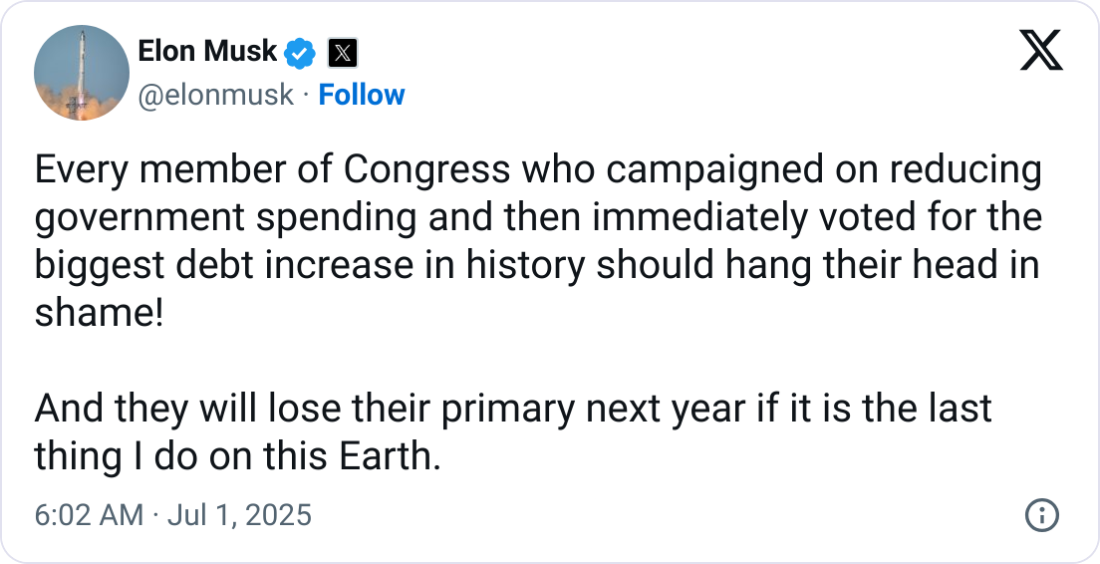 Маск, самый богатый человек в мире, помог Бэнровать кампанию Трампа, но ранее угрожал в отдельном посту, что он будет стремиться сместить всех законодателей, которые поддерживали законопроект.