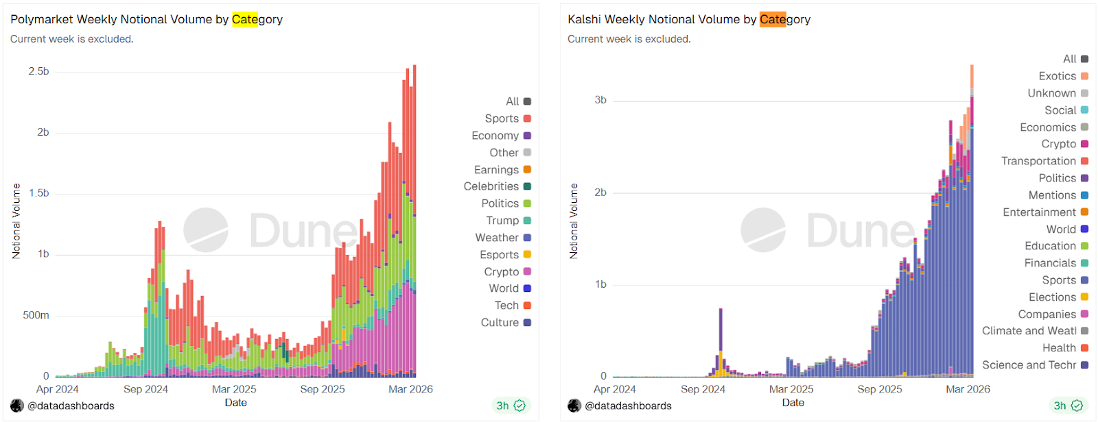 Ставки на спорт являются ведущим источником торговой активности на платформах рынка прогнозов. По данным Dune, на долю контрактов, связанных со спортом, на прошлой неделе пришлось 47,7% недельного условного объема Polymarket и 78,8% Калши.