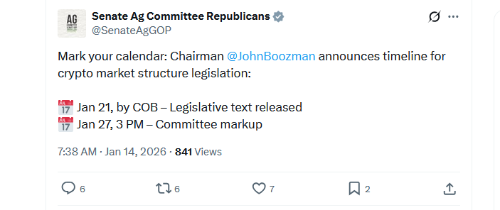 Сенатский комитет по сельскому хозяйству, питанию и лесному хозяйству назначил на 27 января слушания по законопроекту о структуре рынка криптовалют, который призван внести «ясность и определенность» на рынок.