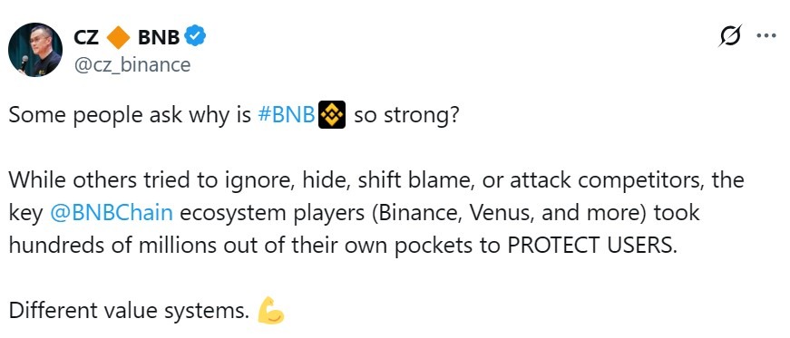 Хотя некоторые члены сообщества сомневаются, почему крах BNB «почти не пострадал», соучредитель Binance Чанпэн Чжао защищал актив, заявив, что BNB силен, потому что игроки экосистемы BNB Chain «взяли сотни миллионов из своих карманов, чтобы защитить пользователей».