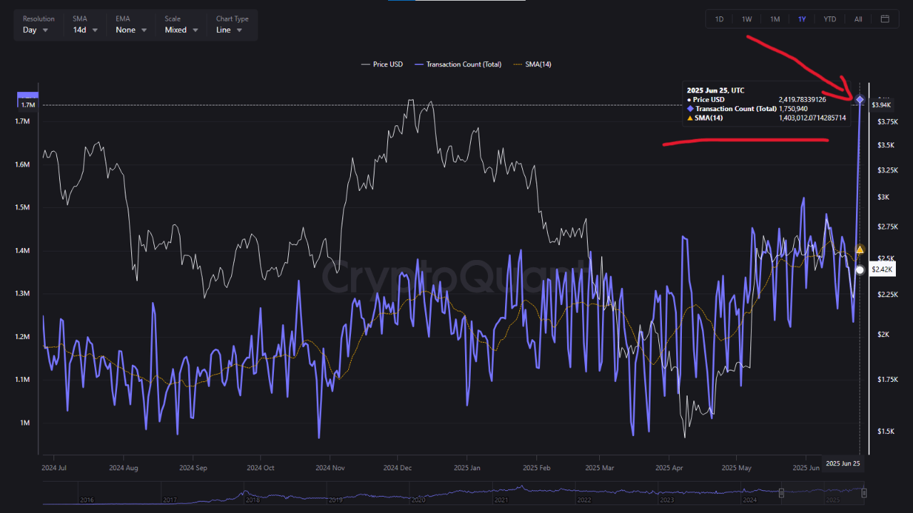 Анализ Алемана фокусируется на метрике Ethereum «Количество транзакций (общее)», которая фиксирует все формы деятельности, включая трансферы ETH, выполнение смарт -контрактов и взаимодействие с децентрализованными приложениями и протоколов DEFI.