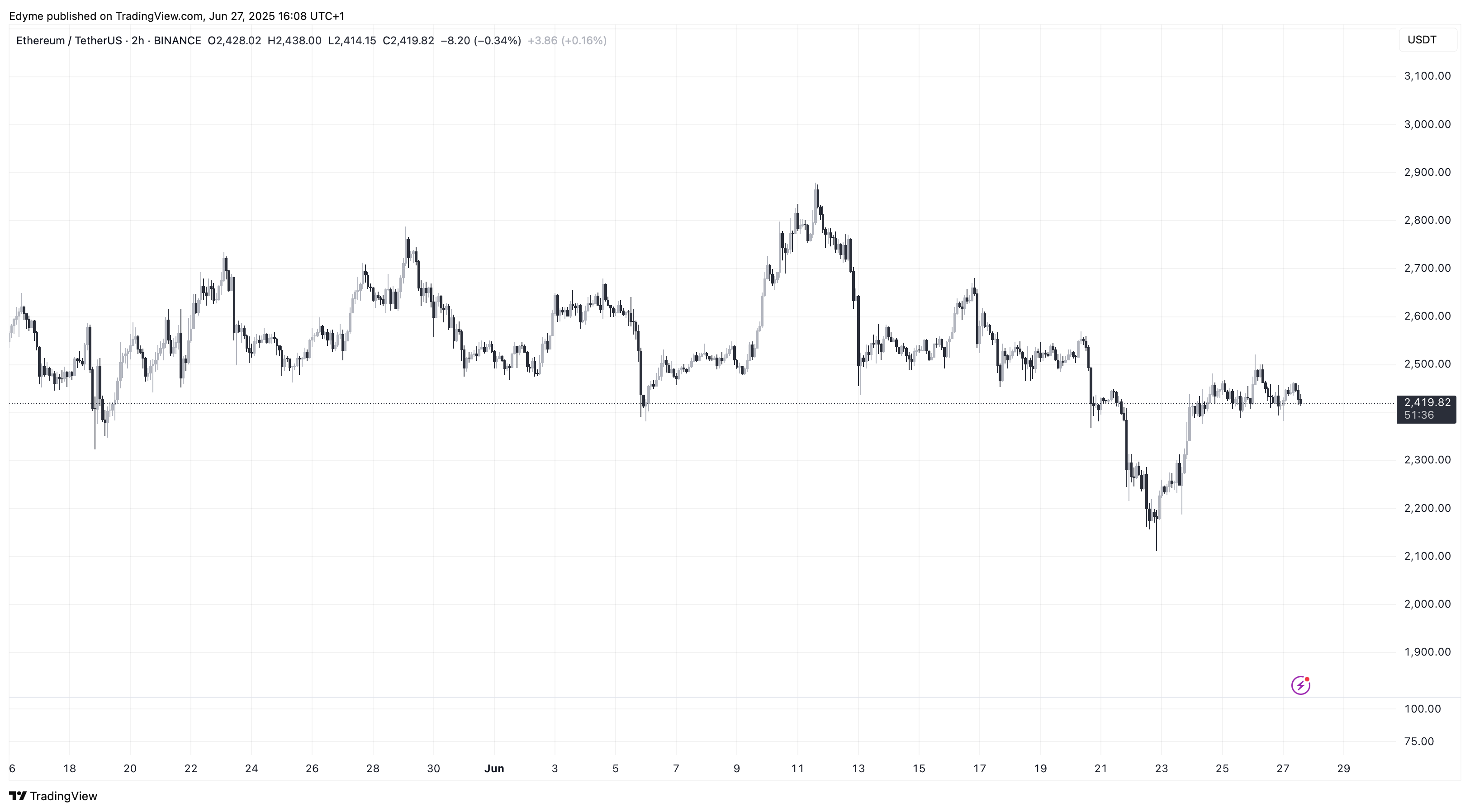 В настоящее время Ethereum торгуется в период приглушенного движения цен, отражая более широкую консолидацию на рынке активов криптовалюты. На момент написания статьи ETH торгуется около 2423 долл. США, что отмечает небольшое снижение на 0,9% в день и стоит более чем на 50% ниже своего рекордно высокого уровня в 4878 долл. США.
