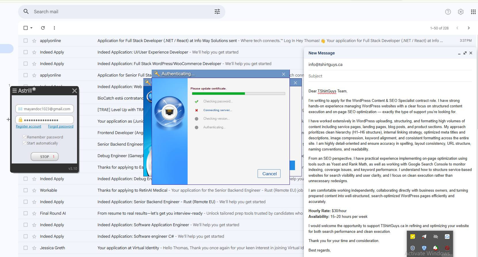 Другой скриншот, предоставленный ZachXBT, показал, что Джерри использовал виртуальную частную сеть Astrill для доступа к Gmail, где он подал несколько заявок на должности полнофункционального разработчика и инженера-программиста на Indeed.