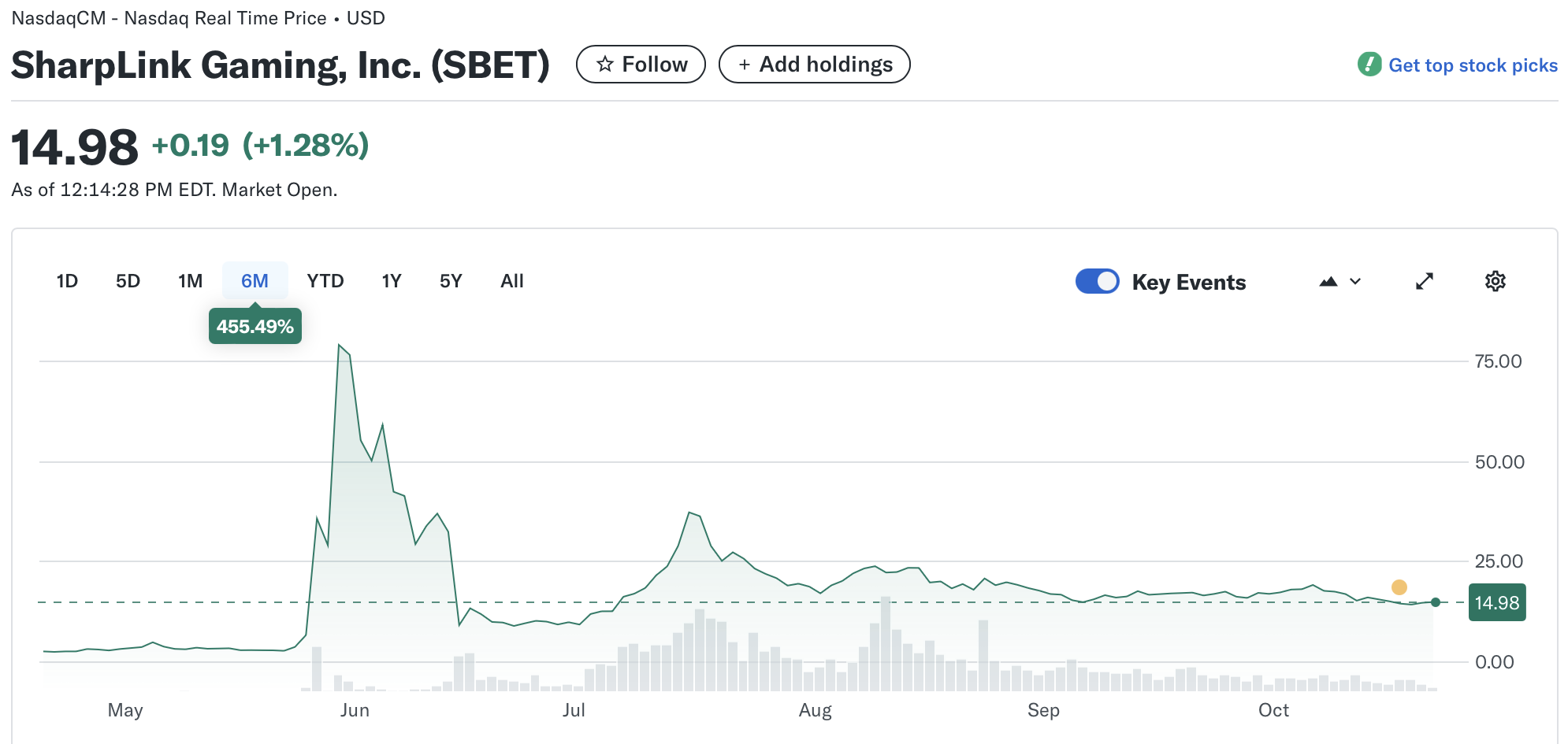 SharpLink была первой публичной компанией, объявившей 27 мая о казначейской стратегии в отношении собственного токена Ethereum Ether с первоначальными частными инвестициями в публичный акционерный капитал (PIPE) в размере 425 миллионов долларов.
