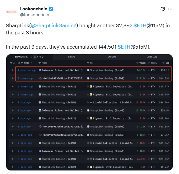 В понедельник Sharplink стал крупнейшим корпоративным владельцем ETH, и в более позднем X Post Sharplink намекнула, что намеревается провести 1 миллион ETH для своей казначейства.