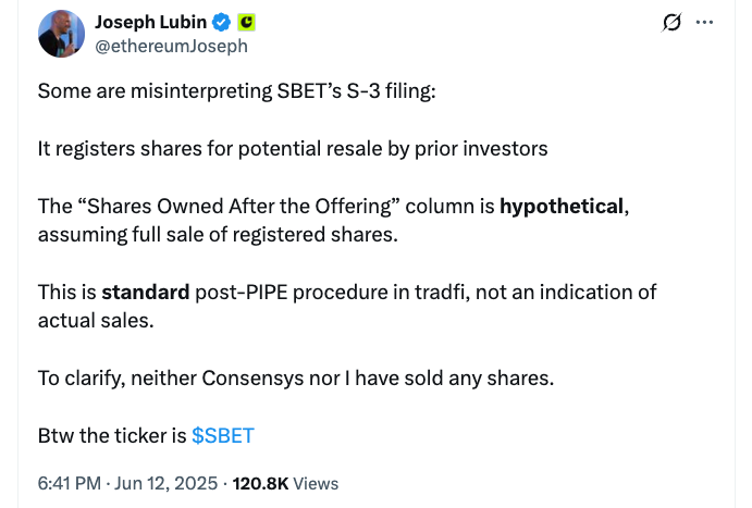 Председатель Sharplink Любин пояснил, что это была обычная процедура регулирования, а не инсайдерскую разгрузку.
