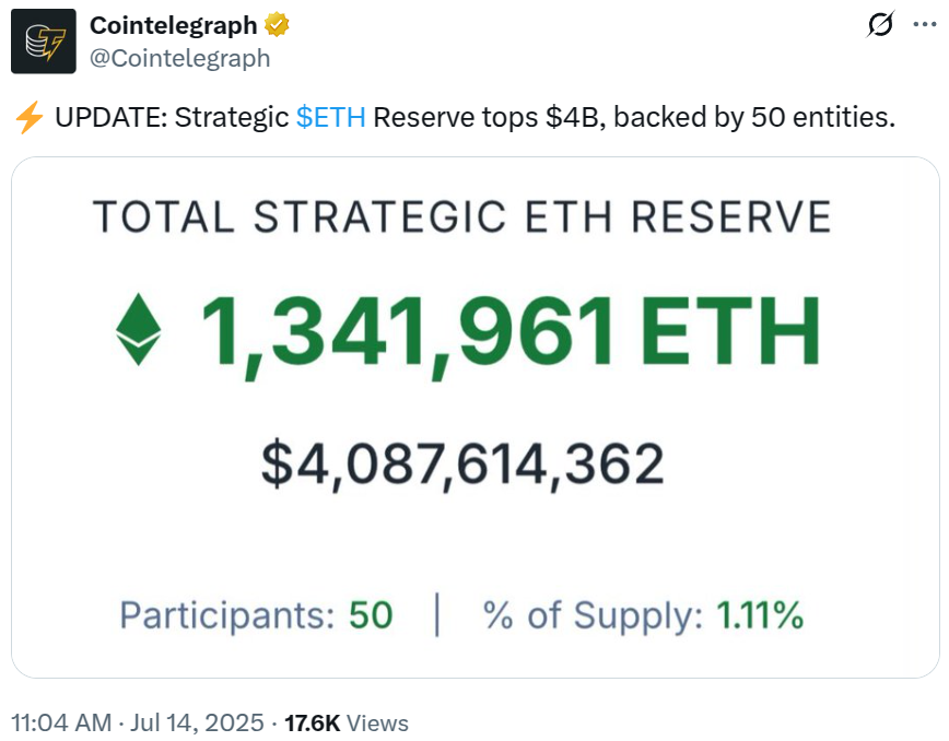 По всем направлениям корпоративные эфирные резервы в настоящее время достигли почти 1,34 миллиона ETH, стоимостью почти 4,1 миллиарда долларов на момент написания.