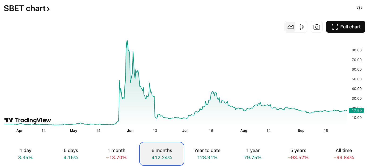 Вскоре после объявления о казначействе ETH в мае Sharplink увидела, как ее акции выросли более чем на 100%, цена акций выросла с 40 долларов 27 мая до почти 90 долларов США 30 мая.