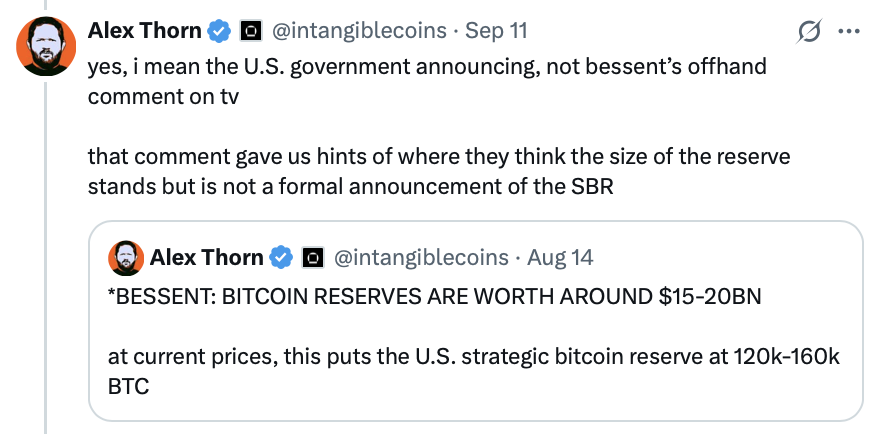 «Я все еще думаю, что есть сильная вероятность того, что правительство США объявит в этом году, что оно сформировало стратегический резерв Биткоин (SBR) и официально считает BTC в качестве стратегического актива», – сказал Торн в x Post в четверг.