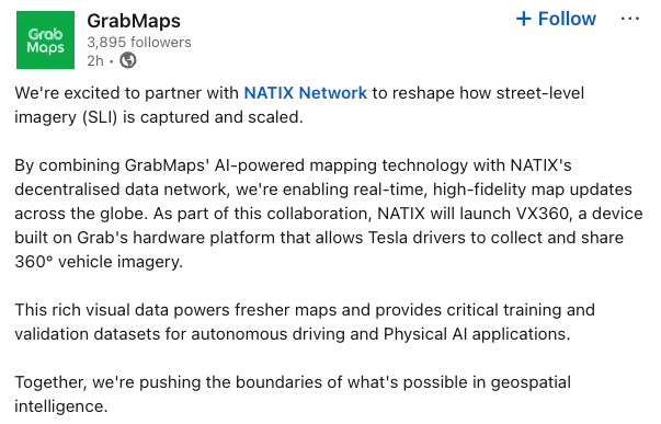 SuperApp Grab в Юго -Восточной Азии сотрудничал с Natix, проектом в рамках децентрализованной физической инфраструктурной сети Solana (DEPIN), для сотрудничества по картированию и технологиям автономного вождения.