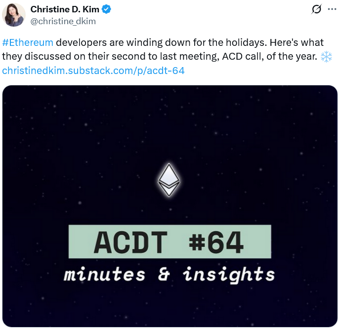 Кристина Ким, вице-президент исследовательской группы Galaxy Digital, поделилась итогами встречи всех основных разработчиков в понедельник, на которой представители Nethermind заявили, что разработчики должны быть готовы двигаться дальше с увеличением лимита газа после следующего хард-форка только для параметров больших двоичных объектов (BPO), который состоится 7 января.