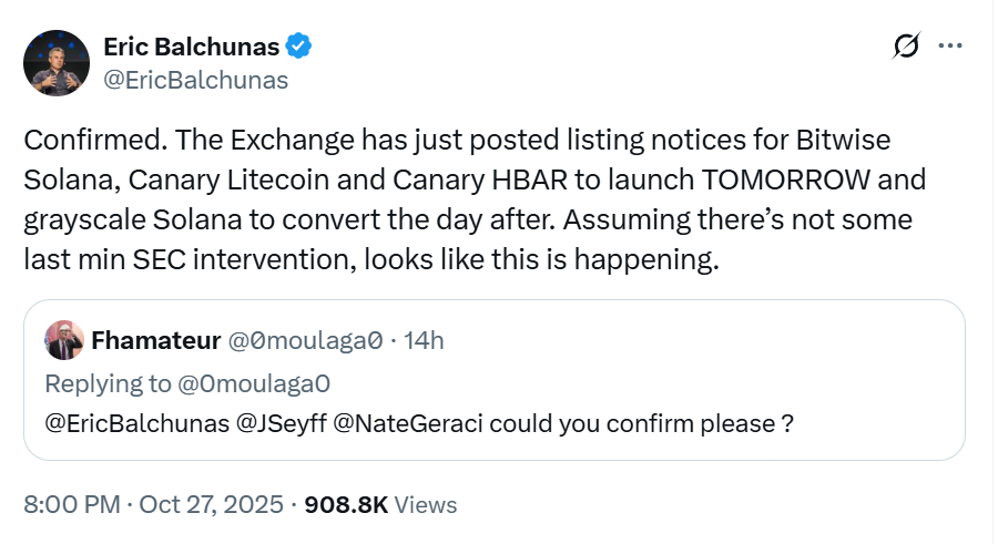 По словам аналитика Bloomberg Эрика Балчунаса, ожидается, что во вторник будут запущены как минимум три альткойн-ETF: ETF Solana (SOL) Bitwise, ETF Canary Litecoin (LTC) и Hedera (HBAR).