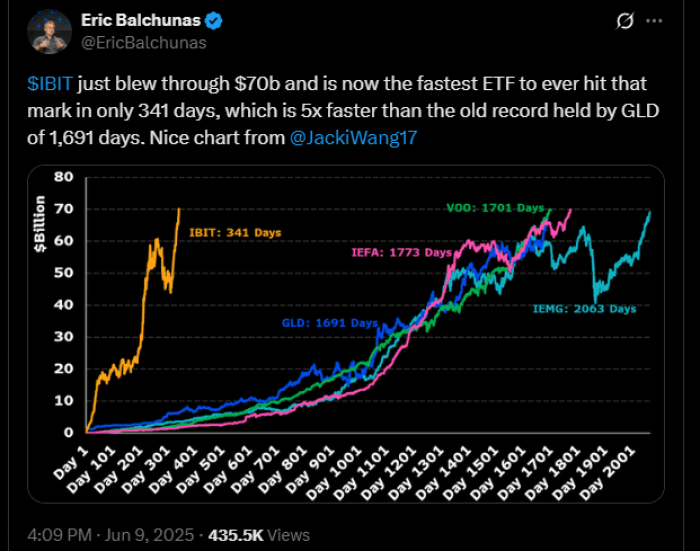 Новости появляются на основе сообщений о том, что BlackRock Bitcoin ETF только что стал самым быстрым ETF, который достиг 70 миллиардов долларов в общем объеме активов.