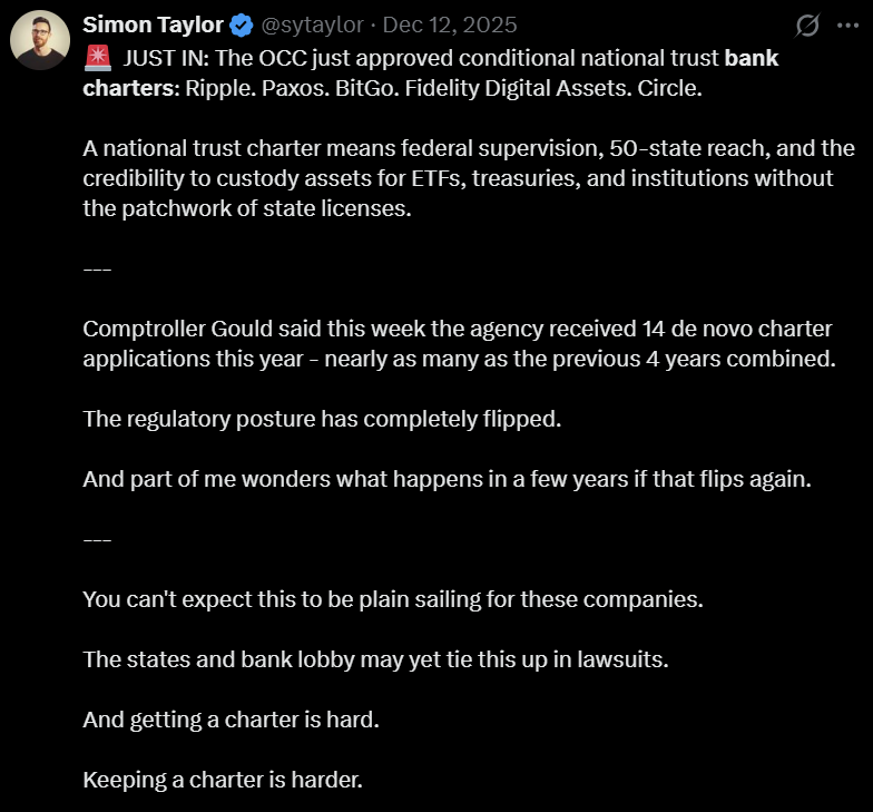 Этот исследовательский этап с тех пор уступил место конкретным регулирующим действиям. В декабре OCC условно утвердил уставы пяти национальных трастовых банков для компаний, занимающихся цифровыми активами: First National Digital Currency Bank, который связан с Circle, Ripple National Trust Bank, BitGo Bank & Trust, Fidelity Digital Assets и Paxos Trust Company.